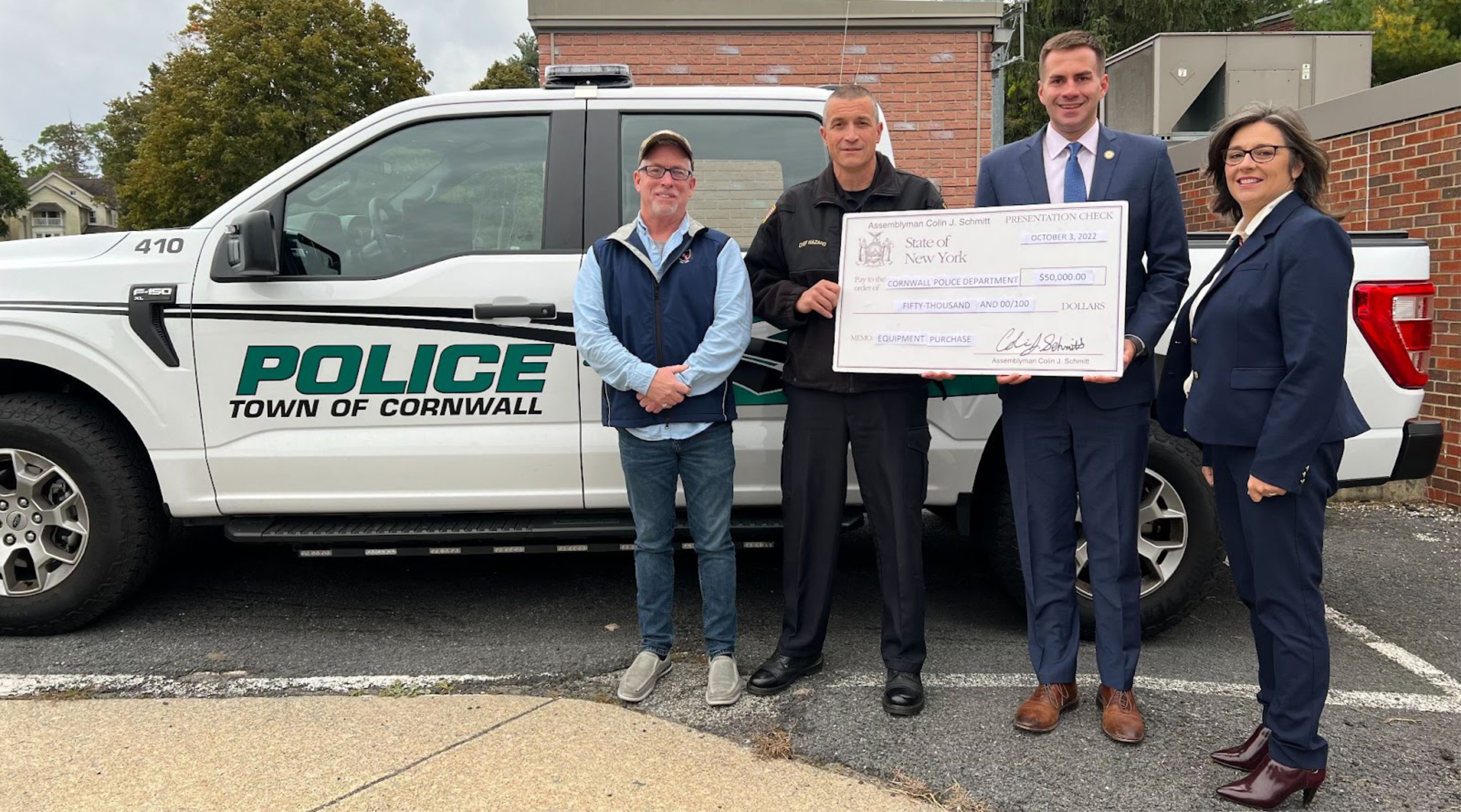 The Town of Cornwall Police Department has received a $50,000 grant toward the purchase of a heavy-duty rescue vehicle. The grant money was presented to Cornwall Police Chief Todd Hazard today by New York State Assemblyman Colin Schmitt.