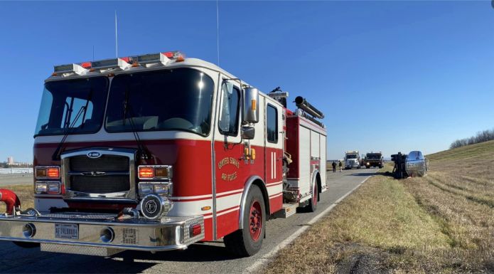 Foam trucks and other fire apparatus responded with a crew of firefighters. Quality Towing responded with two heavy wreckers plus additional equipment to upright the truck.