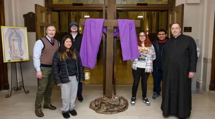 Mount Saint Mary College’s Dominican Scholars of Hope (DSH) aided Fr. Greg Fluet, campus chaplain and Director of Campus Ministry, in setting up the Lenten Cross outside of the college’s Chapel of the Most Holy Rosary on Wednesday, February 22, 2023.
